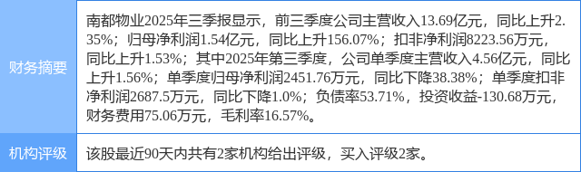 2025年10月30日,开源证券研究员齐东,胡耀文,杜致远发布了对南都物业的研报《公司信息更新报告:扣非利润保持稳定,加大力度推进机器人生态布局》,该研报对南都物业给出“买入”评级。研报中预计公司2025-2027年归母净利润分别为1.68、1.76、1.84亿元,EPS分别为0.89、0.94、0.98元,当前股价对应PE为15.0、14.3、13.7倍,我们认为公司在退出亏损项目后轻装上阵,盈利能力有望修复,维持“买入”评级。证券之星数据中心根据近三年发布的研报数据计算,该研报作者对此股的盈利预测准确度为59.04%。