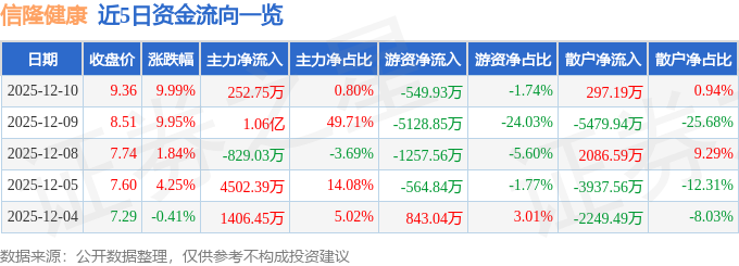 证券之星消息,截至2025年12月10日收盘,信隆健康(002105)报收于9.36元,上涨9.99%,已连续涨停2天,换手率9.26%,成交量33.74万手,成交额3.15亿元。
