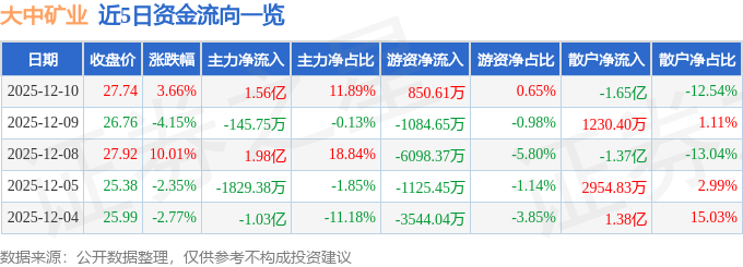 证券之星消息,截至2025年12月10日收盘,大中矿业(001203)报收于27.74元,上涨3.66%,换手率3.66%,成交量47.27万手,成交额13.14亿元。