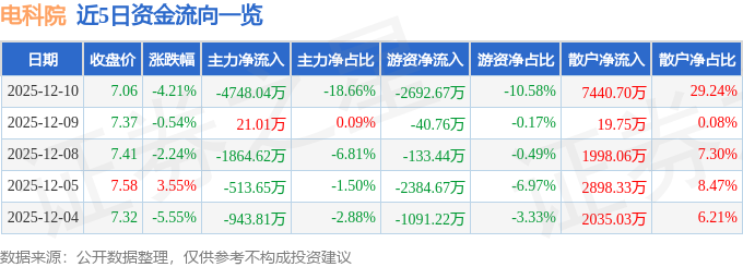证券之星消息,截至2025年12月10日收盘,电科院(300215)报收于7.06元,下跌4.21%,换手率7.16%,成交量35.81万手,成交额2.54亿元。
