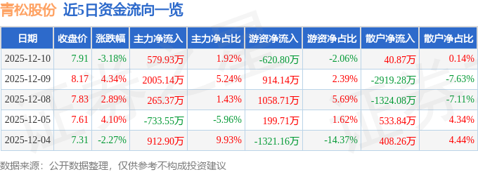 证券之星消息,截至2025年12月10日收盘,青松股份(300132)报收于7.91元,下跌3.18%,换手率7.45%,成交量37.83万手,成交额3.02亿元。