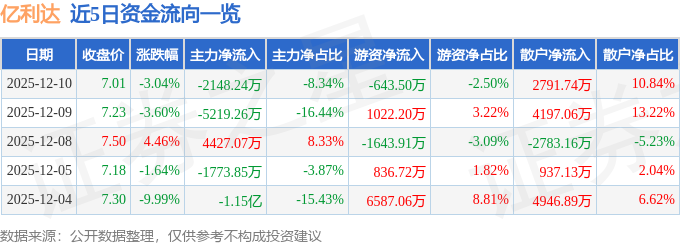 证券之星消息,截至2025年12月10日收盘,亿利达(002686)报收于7.01元,下跌3.04%,换手率7.0%,成交量36.57万手,成交额2.57亿元。