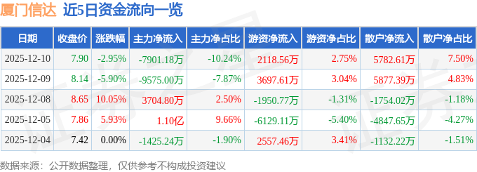 证券之星消息,截至2025年12月10日收盘,厦门信达(000701)报收于7.9元,下跌2.95%,换手率14.53%,成交量97.03万手,成交额7.71亿元。