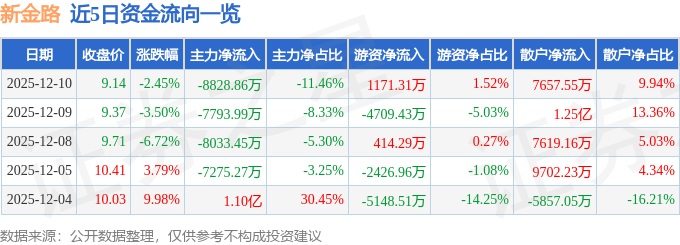 证券之星消息,截至2025年12月10日收盘,新金路(000510)报收于9.14元,下跌2.45%,换手率13.91%,成交量84.42万手,成交额7.7亿元。