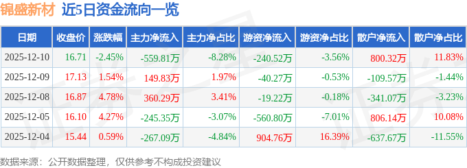 证券之星消息,截至2025年12月10日收盘,锦盛新材(300849)报收于16.71元,下跌2.45%,换手率3.29%,成交量3.99万手,成交额6763.92万元。