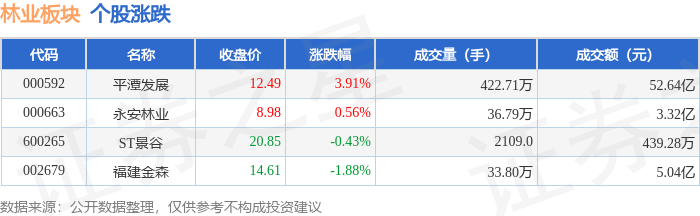 证券之星消息,12月10日林业板块较上一交易日上涨2.62%,平潭发展领涨。当日上证指数报收于3900.5,下跌0.23%。深证成指报收于13316.42,上涨0.29%。林业板块个股涨跌见下表: