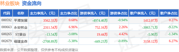 从资金流向上来看,当日林业板块主力资金净流入3151.44万元,游资资金净流出4652.02万元,散户资金净流入1500.59万元。林业板块个股资金流向见下表: