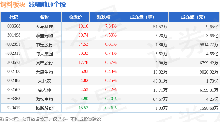 证券之星消息,12月10日饲料板块较上一交易日上涨0.9%,天马科技领涨。当日上证指数报收于3900.5,下跌0.23%。深证成指报收于13316.42,上涨0.29%。饲料板块个股涨跌见下表: