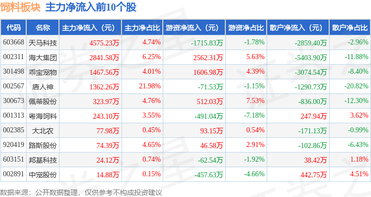 从资金流向上来看,当日饲料板块主力资金净流入5558.77万元,游资资金净流入3319.59万元,散户资金净流出8878.36万元。饲料板块个股资金流向见下表: