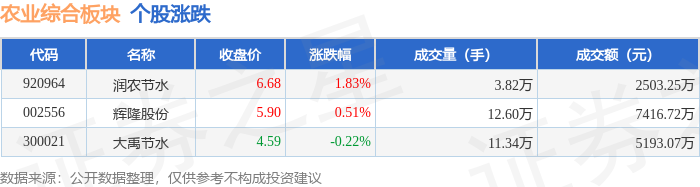 证券之星消息,12月10日农业综合板块较上一交易日上涨0.21%,润农节水领涨。当日上证指数报收于3900.5,下跌0.23%。深证成指报收于13316.42,上涨0.29%。农业综合板块个股涨跌见下表: