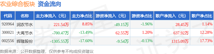 从资金流向上来看,当日农业综合板块主力资金净流出2006.02万元,游资资金净流入53.01万元,散户资金净流入1953.01万元。农业综合板块个股资金流向见下表: