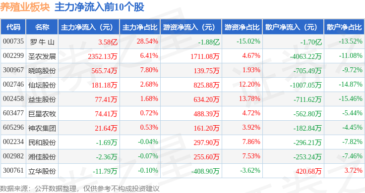从资金流向上来看,当日养殖业板块主力资金净流入1.77亿元,游资资金净流出1.22亿元,散户资金净流出5499.75万元。养殖业板块个股资金流向见下表: