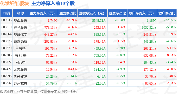 从资金流向上来看,当日化学纤维板块主力资金净流入1.08亿元,游资资金净流出7995.04万元,散户资金净流出2819.09万元。化学纤维板块个股资金流向见下表:
