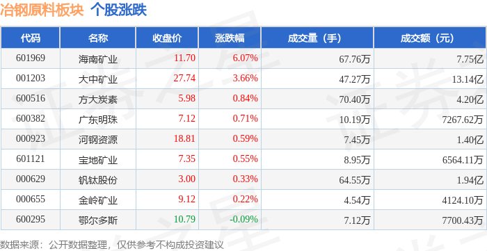 证券之星消息,12月10日冶钢原料板块较上一交易日上涨1.94%,海南矿业领涨。当日上证指数报收于3900.5,下跌0.23%。深证成指报收于13316.42,上涨0.29%。冶钢原料板块个股涨跌见下表: