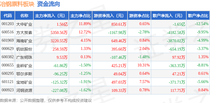 从资金流向上来看,当日冶钢原料板块主力资金净流入2.4亿元,游资资金净流入1700.85万元,散户资金净流出2.57亿元。冶钢原料板块个股资金流向见下表: