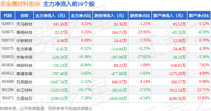 从资金流向上来看,当日非金属材料板块主力资金净流出1.28亿元,游资资金净流出959.58万元,散户资金净流入1.38亿元。非金属材料板块个股资金流向见下表: