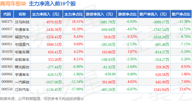 从资金流向上来看,当日商用车板块主力资金净流入309.0万元,游资资金净流入6988.67万元,散户资金净流出7297.67万元。商用车板块个股资金流向见下表: