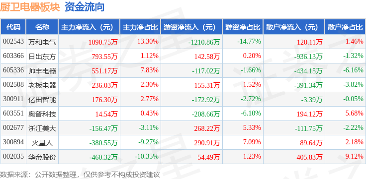 从资金流向上来看,当日厨卫电器板块主力资金净流入1865.0万元,游资资金净流出797.95万元,散户资金净流出1067.06万元。厨卫电器板块个股资金流向见下表: