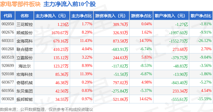从资金流向上来看,当日家电零部件板块主力资金净流出1.38亿元,游资资金净流入1179.22万元,散户资金净流入1.27亿元。家电零部件板块个股资金流向见下表: