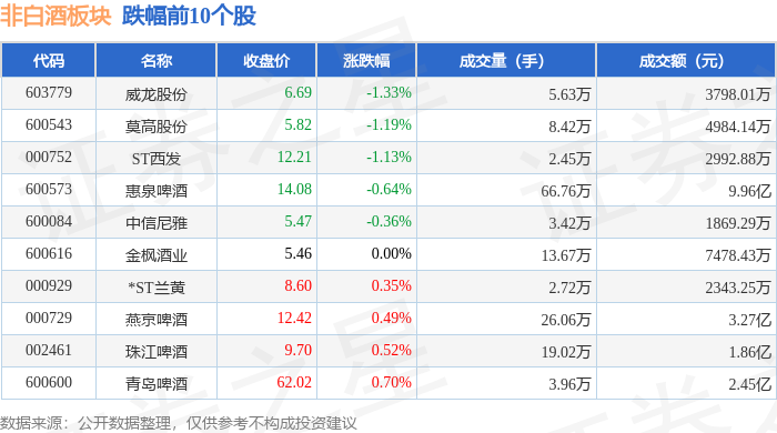 从资金流向上来看,当日非白酒板块主力资金净流出1.08亿元,游资资金净流入4797.32万元,散户资金净流入5993.37万元。非白酒板块个股资金流向见下表: