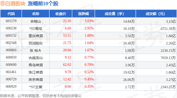 证券之星消息,12月10日非白酒板块较上一交易日上涨0.9%,会稽山领涨。当日上证指数报收于3900.5,下跌0.23%。深证成指报收于13316.42,上涨0.29%。非白酒板块个股涨跌见下表:
