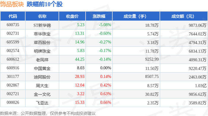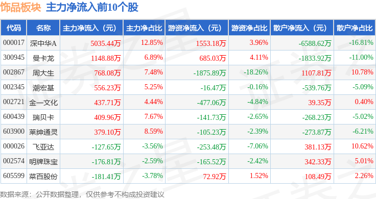 从资金流向上来看,当日饰品板块主力资金净流入4415.86万元,游资资金净流入930.46万元,散户资金净流出5346.32万元。饰品板块个股资金流向见下表: