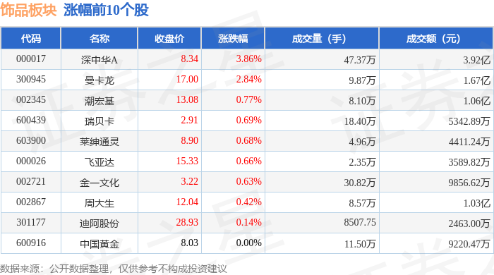 证券之星消息,12月10日饰品板块较上一交易日上涨0.31%,深中华A领涨。当日上证指数报收于3900.5,下跌0.23%。深证成指报收于13316.42,上涨0.29%。饰品板块个股涨跌见下表: