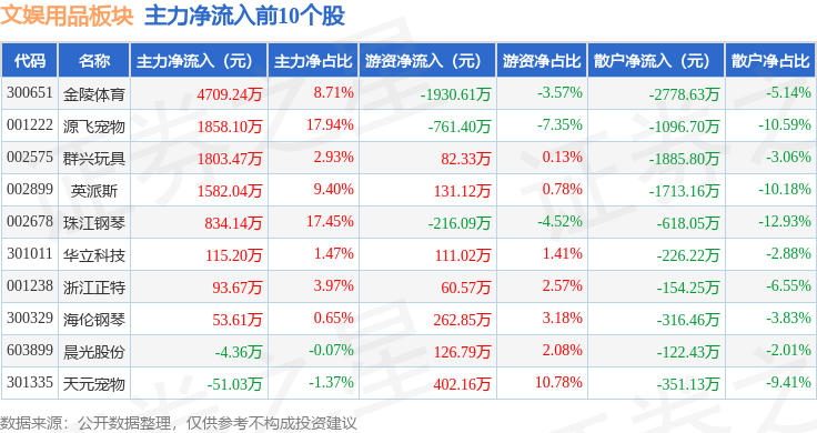从资金流向上来看,当日文娱用品板块主力资金净流出1.47亿元,游资资金净流入3866.75万元,散户资金净流入1.09亿元。文娱用品板块个股资金流向见下表: