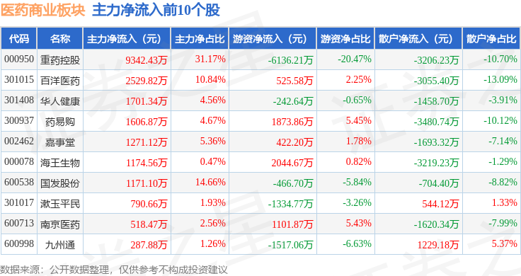 从资金流向上来看,当日医药商业板块主力资金净流出1.74亿元,游资资金净流出1.05亿元,散户资金净流入2.79亿元。医药商业板块个股资金流向见下表:
