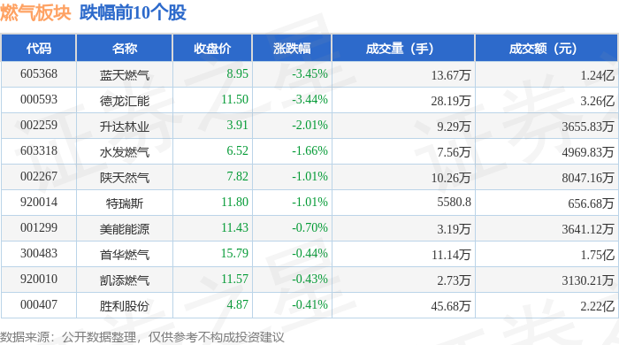 证券之星消息,12月10日燃气板块较上一交易日上涨0.47%,九丰能源领涨。当日上证指数报收于3900.5,下跌0.23%。深证成指报收于13316.42,上涨0.29%。燃气板块个股涨跌见下表: