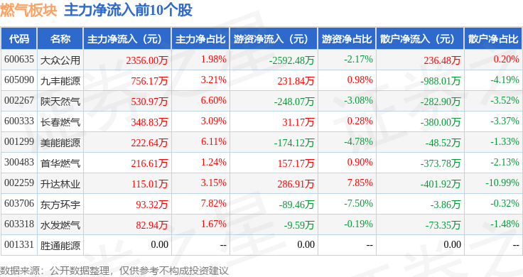 从资金流向上来看,当日燃气板块主力资金净流出1.13亿元,游资资金净流入1860.83万元,散户资金净流入9462.05万元。燃气板块个股资金流向见下表: