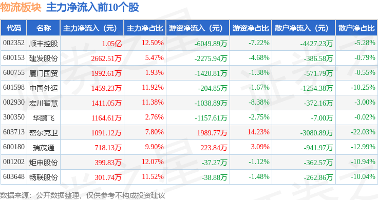 从资金流向上来看,当日物流板块主力资金净流出4.29亿元,游资资金净流入8509.85万元,散户资金净流入3.44亿元。物流板块个股资金流向见下表: