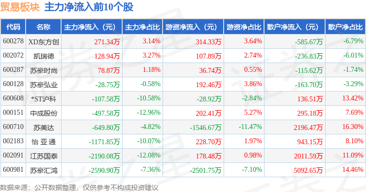 从资金流向上来看,当日贸易板块主力资金净流出2.58亿元,游资资金净流入350.55万元,散户资金净流入2.54亿元。贸易板块个股资金流向见下表: