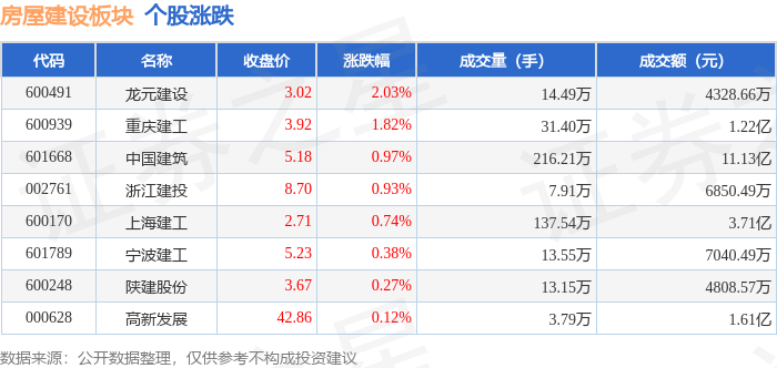 证券之星消息,12月10日房屋建设板块较上一交易日上涨0.92%,龙元建设领涨。当日上证指数报收于3900.5,下跌0.23%。深证成指报收于13316.42,上涨0.29%。房屋建设板块个股涨跌见下表: