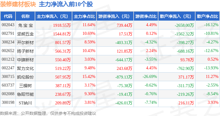 从资金流向上来看,当日装修建材板块主力资金净流出1.28亿元,游资资金净流入1661.27万元,散户资金净流入1.11亿元。装修建材板块个股资金流向见下表: