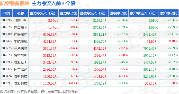 从资金流向上来看,当日航空装备板块主力资金净流入1.46亿元,游资资金净流出6367.11万元,散户资金净流出8230.49万元。航空装备板块个股资金流向见下表: