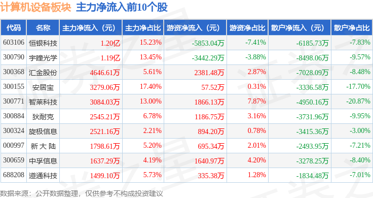 从资金流向上来看,当日计算机设备板块主力资金净流出18.68亿元,游资资金净流入9.36亿元,散户资金净流入9.32亿元。计算机设备板块个股资金流向见下表: