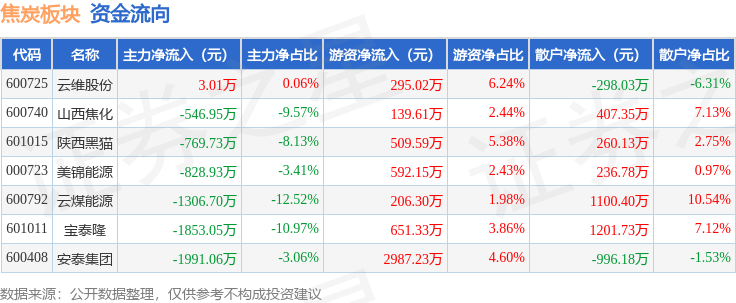 从资金流向上来看,当日焦炭板块主力资金净流出7293.41万元,游资资金净流入5381.24万元,散户资金净流入1912.18万元。焦炭板块个股资金流向见下表: