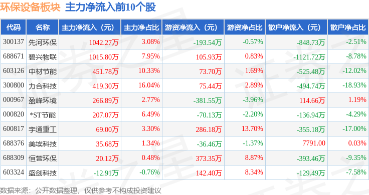 从资金流向上来看,当日环保设备板块主力资金净流出8505.83万元,游资资金净流入3871.23万元,散户资金净流入4634.6万元。环保设备板块个股资金流向见下表: