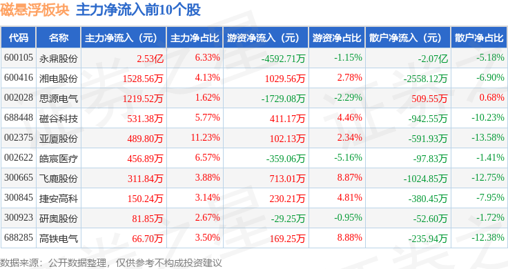 从资金流向上来看,当日磁悬浮板块主力资金净流出2.38亿元,游资资金净流出5824.78万元,散户资金净流入2.96亿元。磁悬浮板块个股资金流向见下表: