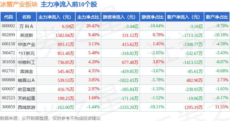 从资金流向上来看,当日冰雪产业板块主力资金净流入1.45亿元,游资资金净流出4.4亿元,散户资金净流入2.94亿元。冰雪产业板块个股资金流向见下表: