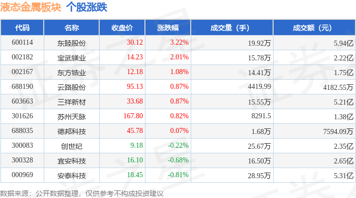 证券之星消息,12月10日液态金属板块较上一交易日上涨0.77%,东睦股份领涨。当日上证指数报收于3900.5,下跌0.23%。深证成指报收于13316.42,上涨0.29%。液态金属板块个股涨跌见下表: