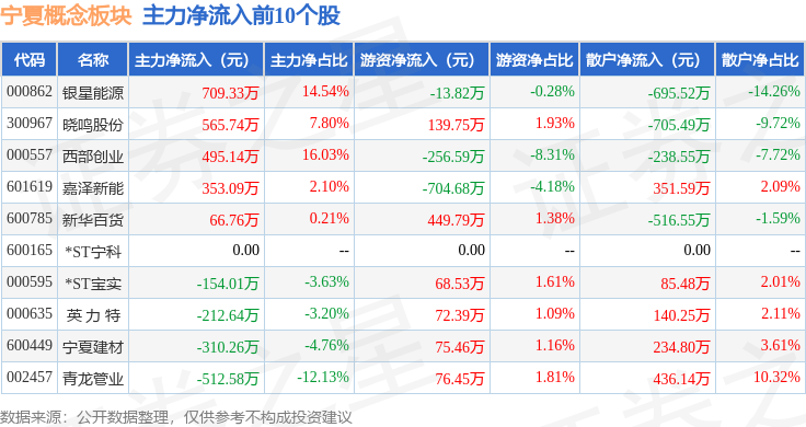 从资金流向上来看,当日宁夏概念板块主力资金净流出5817.0万元,游资资金净流入780.93万元,散户资金净流入5036.07万元。宁夏概念板块个股资金流向见下表: