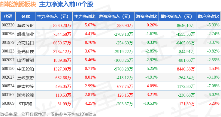 从资金流向上来看,当日邮轮游艇板块主力资金净流入5758.07万元,游资资金净流出1.93亿元,散户资金净流入1.35亿元。邮轮游艇板块个股资金流向见下表: