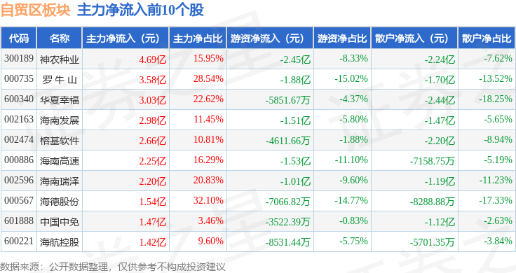 从资金流向上来看,当日自贸区板块主力资金净流出17.53亿元,游资资金净流出9.5亿元,散户资金净流入27.02亿元。自贸区板块个股资金流向见下表: