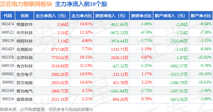 从资金流向上来看,当日泛在电力物联网板块主力资金净流出25.83亿元,游资资金净流入5.15亿元,散户资金净流入20.68亿元。泛在电力物联网板块个股资金流向见下表: