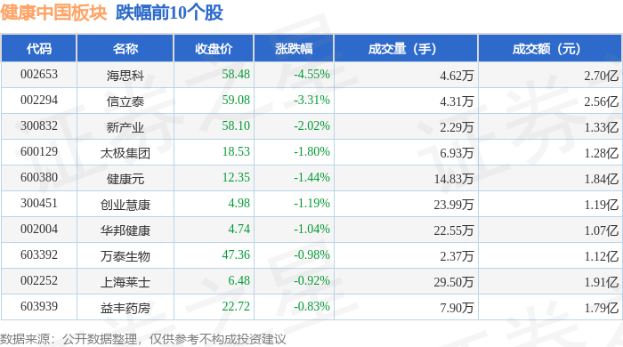 从资金流向上来看,当日健康中国板块主力资金净流出6.69亿元,游资资金净流入4462.14万元,散户资金净流入6.24亿元。健康中国板块个股资金流向见下表: