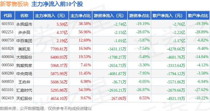 从资金流向上来看,当日新零售板块主力资金净流入9.95亿元,游资资金净流出7.4亿元,散户资金净流出2.55亿元。新零售板块个股资金流向见下表: