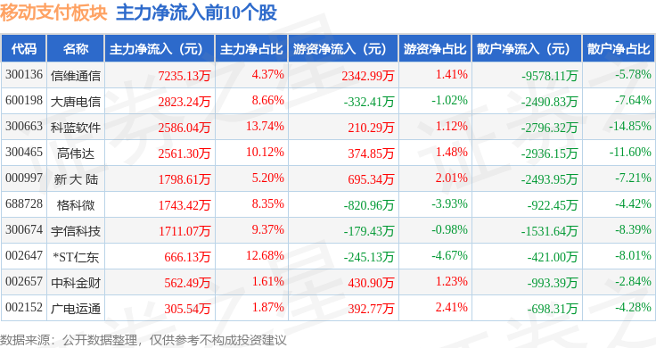 从资金流向上来看,当日移动支付板块主力资金净流出9.54亿元,游资资金净流入1.05亿元,散户资金净流入8.48亿元。移动支付板块个股资金流向见下表: