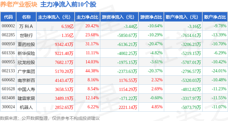 从资金流向上来看,当日养老产业板块主力资金净流入3.85亿元,游资资金净流出4.13亿元,散户资金净流入2718.86万元。养老产业板块个股资金流向见下表: